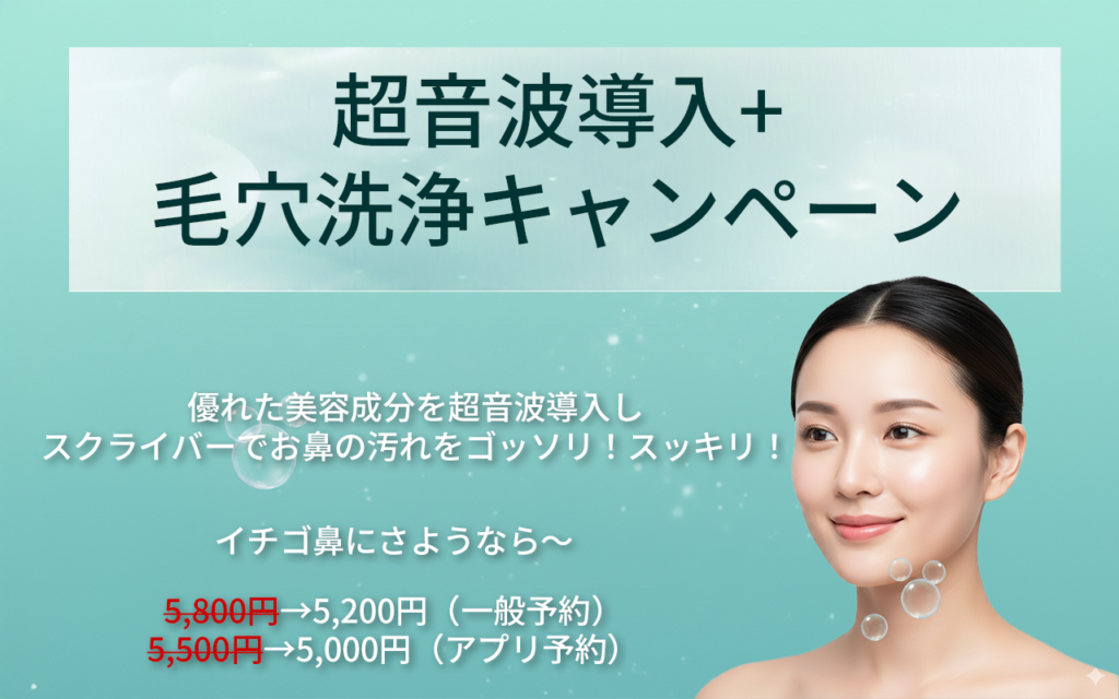 | PDRN + お鼻毛穴洗浄スクライバー 超音波導入で導入・・・ | 7,300円(一般予約) 7,000円(アプリ予約) |