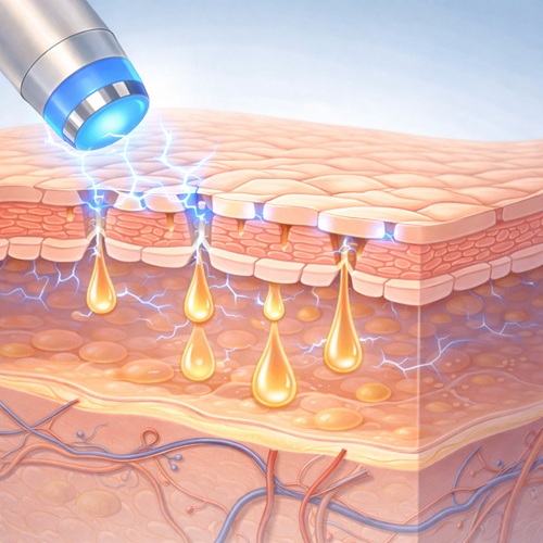エレクトロポレーションは、高速な電気パルスを用いて一時的に細胞膜に穴をあけ、その穴の開閉が断続的に繰り返されることで薬剤の通り道を失うことなく真皮層まで浸透させる技術です。
